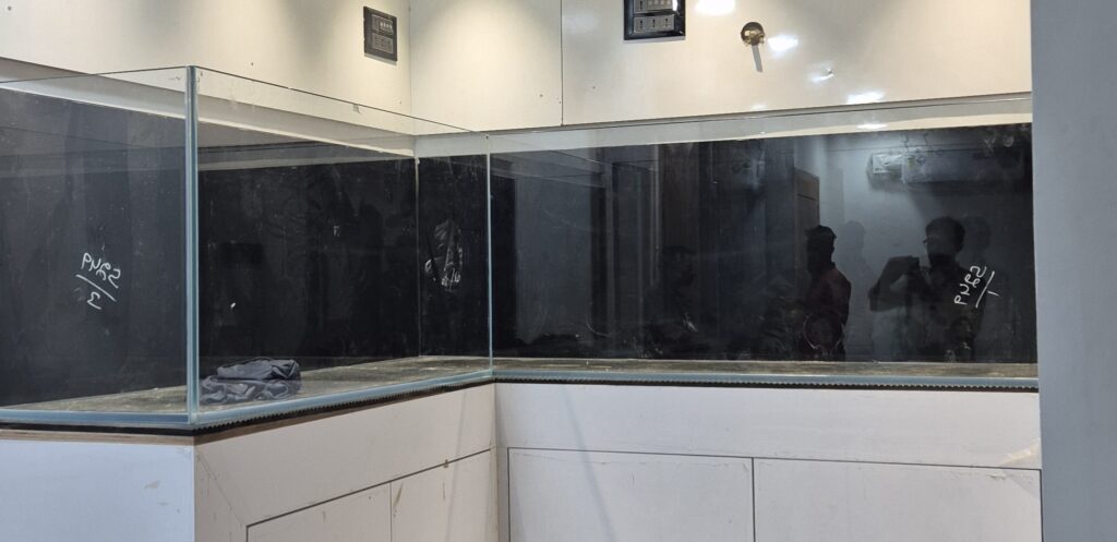 The aquarium measures an impressive 15 x 2 x 2.5 ft, built in an L-shaped design to perfectly fit the client’s space. Constructed with 19mm toughened glass, the front panels are extra clear to ensure maximum viewing clarity. For durability and precision, we used Wacker 121 aquarium-grade silicon with our signature Zero silicon pasting technique, making the build both seamless and long-lasting.